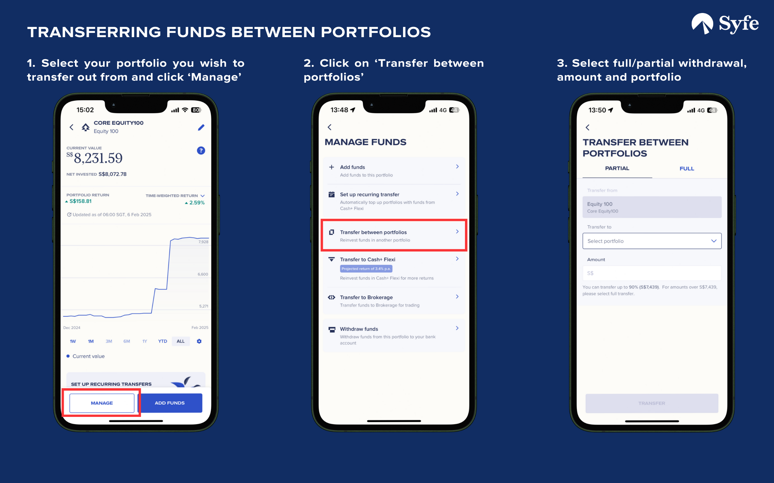 If you have more than one Syfe portfolio, you can transfer funds from one portfolio to another directly via your Syfe app.