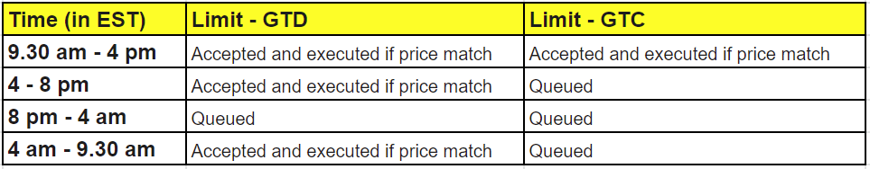 | 4:00 a.m. – 9:30 a.m. | Accepted & executed if price matches | Queued |