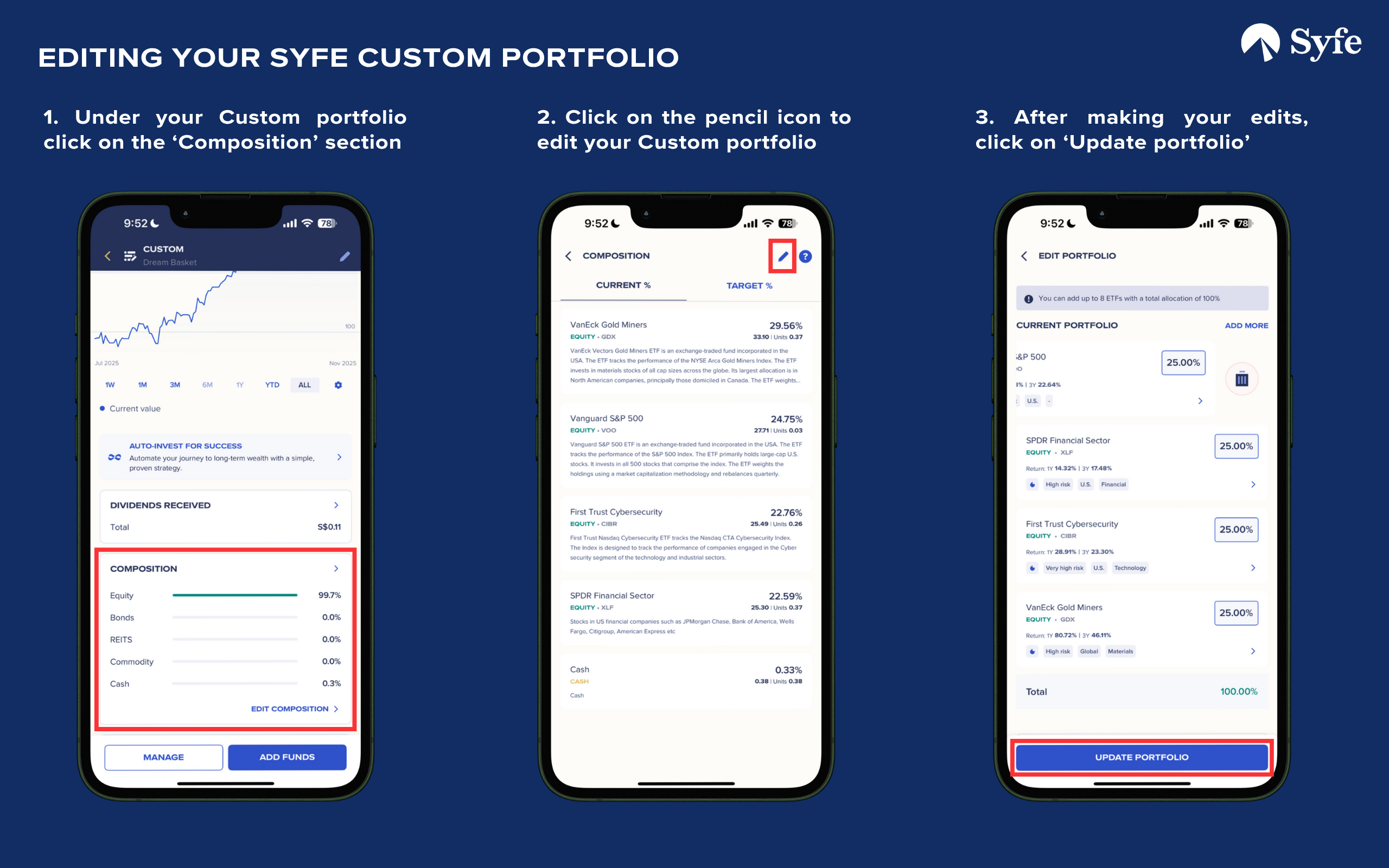 - On the edit page, you can add, remove, or adjust the allocation of ETFs in your portfolio.