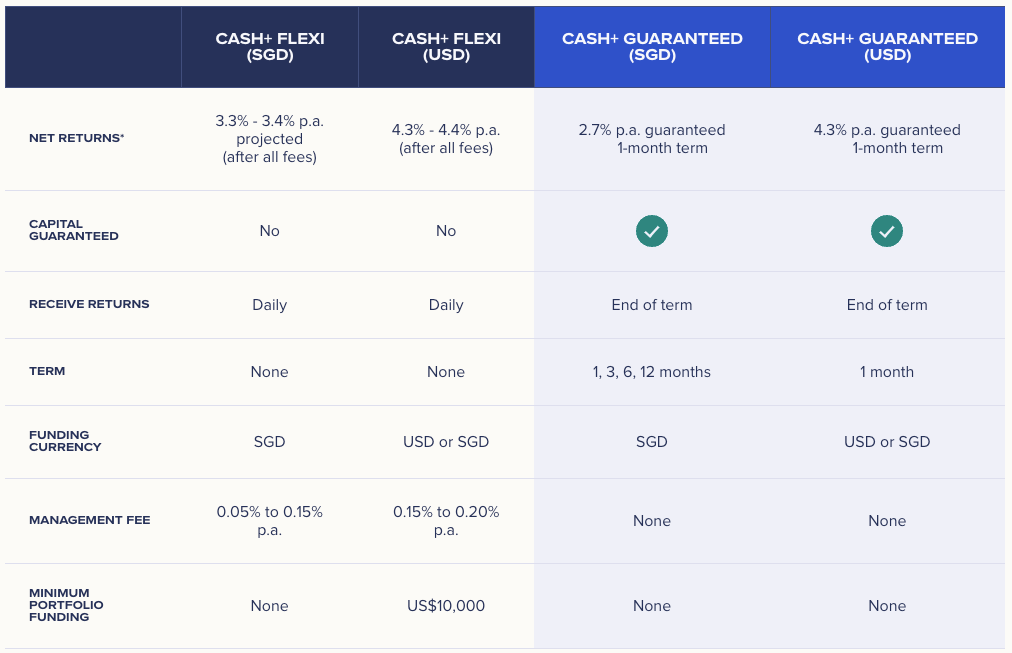 - For Cash+ Guaranteed (USD) portfolios: The guaranteed returns are based on the USD amount invested into the portfolio. If you fund your portfolio in SGD, we will automatically convert the SGD into USD to be invested, and the guaranteed return displayed in the app will apply to the USD value.