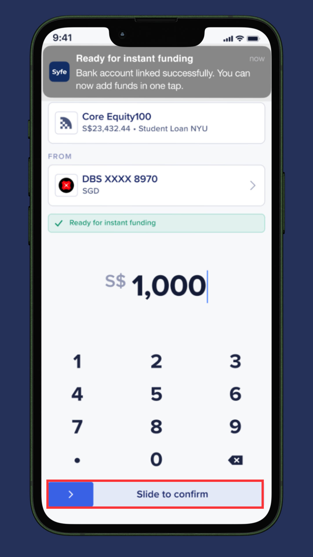 Step 4: You will be redirected from your bank back to Syfe, look out for a push notification OR wait for linking status to change to "Ready for instant funding"