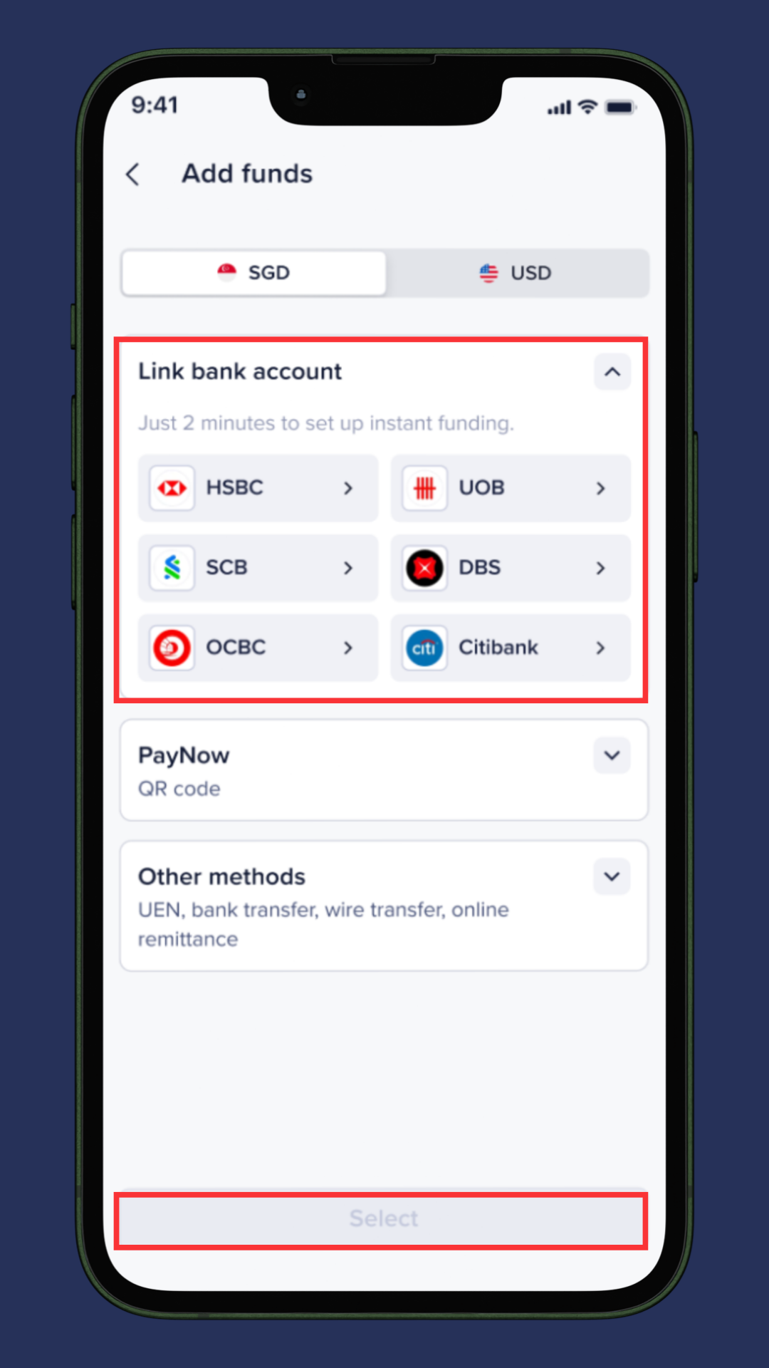 Before setting up, decide which bank account is your preferred bank account that will always have sufficient funds to meet your investment objective. Your savings or salary-crediting account will enable you to have worry-free* funding into Syfe when you decide to seize that market opportunity. Set up a direct debit to stay on track for your investment goals.